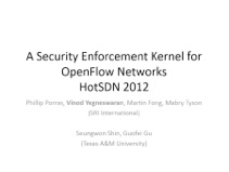 P.A. Porras, S. Shin, S. Yegneswaran, M.W. Fong, M. Tyson, and G. Gu, "A Security Enforcement Kernel for OpenFlow Networks," in Proceedings of the ACM Sigcomm Workshop on Hot Topics in Software Defined Networking (HotSDN), Helsinki, FI, August 2012.